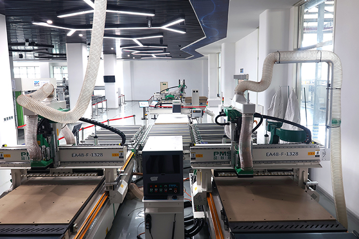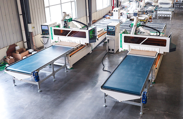 品脈數(shù)控一拖二智能開料單元是一套自動(dòng)化程度比較高的數(shù)控開料解決方案。開料單元由一臺(tái)高速自動(dòng)貼標(biāo)機(jī)、兩臺(tái)全自動(dòng)數(shù)控開料中心以及動(dòng)力滾筒線、中控系統(tǒng)組成。人工只需將板材放置在升降機(jī)上,由貼標(biāo)機(jī)自動(dòng)貼標(biāo),再由中控系統(tǒng)自動(dòng)分配至開料中心,完成板材切割工作。如選配機(jī)器人系統(tǒng),可由機(jī)器人完成碼垛,余料利用及廢料輸出等工作。