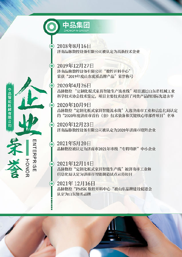 濟(jì)南品脈數(shù)控設(shè)備有限公司擁有濟(jì)南高新區(qū)、德州齊河兩大生產(chǎn)廠區(qū),主要從事智能化數(shù)控設(shè)備的設(shè)計、研發(fā)與生產(chǎn),為專業(yè)家具制造商提供工業(yè)4.0定制家具生產(chǎn)線及智能工廠整體規(guī)劃解決方案。