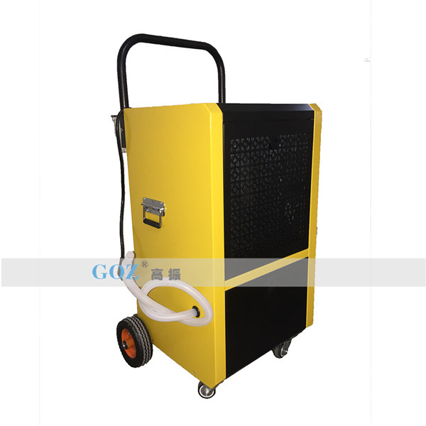 高振手推車除濕機通過風(fēng)機將潮濕空氣抽入機器內(nèi)部,通過壓縮機制冷將蒸發(fā)器降溫至露點以下,潮濕空氣經(jīng)過蒸發(fā)器在表面凝結(jié)成水,匯集至接水盤后,流入水箱中,干爽空氣經(jīng)冷凝器重新加熱由出風(fēng)口排出,這樣不斷循環(huán)將室內(nèi)濕度降低。