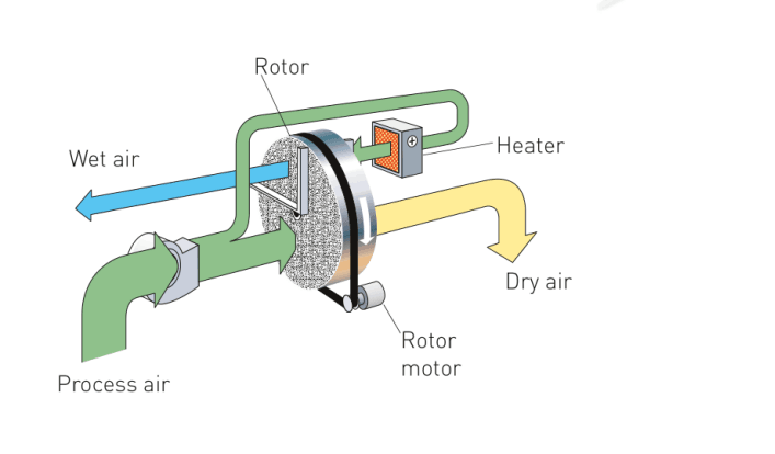 在再生過程中,再生空氣經(jīng)過加熱后(120℃左右),進(jìn)入轉(zhuǎn)輪再生區(qū)扇面,在高溫狀態(tài)下,轉(zhuǎn)輪中的水分子被脫附,散失到再生 空氣中。再生空氣由于在脫附過程中損失了熱量,自身溫度降低,變成了含濕量很大的濕空氣,由再生風(fēng)機(jī)排至室外。除濕和再生同時(shí)進(jìn)行,待處理空氣不斷除濕,轉(zhuǎn)輪不斷再生,對(duì)空氣進(jìn)行連續(xù)除濕。