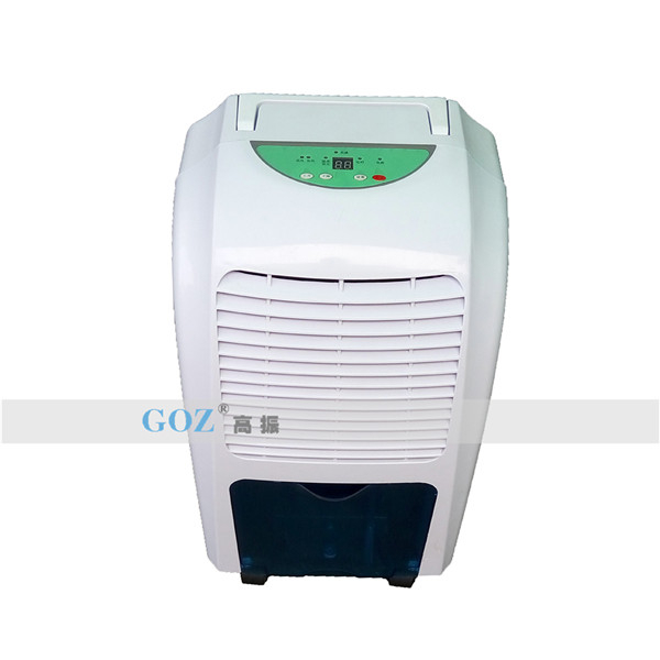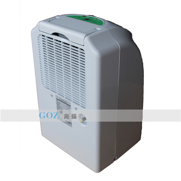 高振商用除濕機通過風(fēng)機將潮濕空氣抽入機器內(nèi)部,通過壓縮機制冷將蒸發(fā)器降溫至露點以下,潮濕空氣經(jīng)過蒸發(fā)器在表面凝結(jié)成水,匯集至接水盤后,流入水箱中,干爽空氣經(jīng)冷凝器重新加熱由出風(fēng)口排出,這樣不斷循環(huán)將室內(nèi)濕度降低。