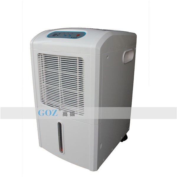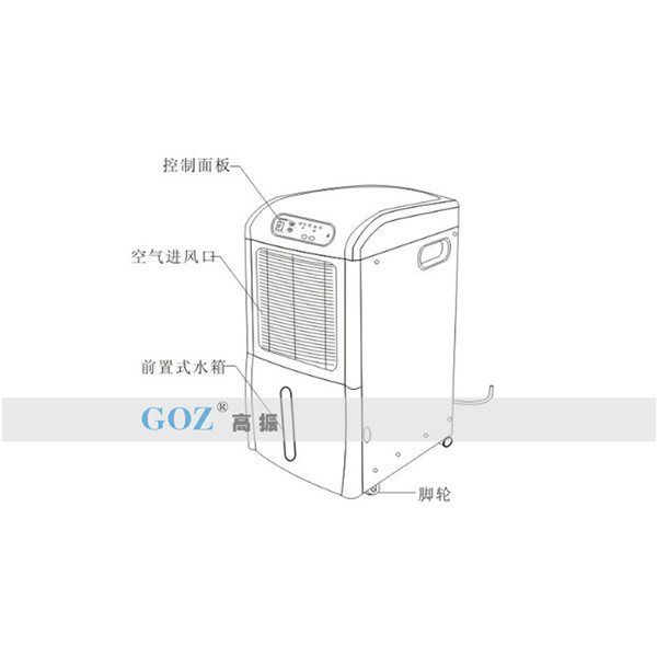 高振商用除濕機通過風(fēng)機將潮濕空氣抽入機器內(nèi)部,通過壓縮機制冷將蒸發(fā)器降溫至露點以下,潮濕空氣經(jīng)過蒸發(fā)器在表面凝結(jié)成水,匯集至接水盤后,流入水箱中,干爽空氣經(jīng)冷凝器重新加熱由出風(fēng)口排出,這樣不斷循環(huán)將室內(nèi)濕度降低。