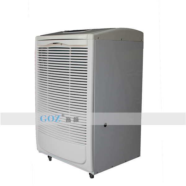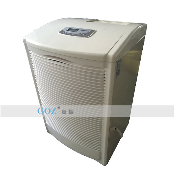 高振商用除濕機通過風機將潮濕空氣抽入機器內(nèi)部,通過壓縮機制冷將蒸發(fā)器降溫至露點以下,潮濕空氣經(jīng)過蒸發(fā)器在表面凝結(jié)成水,匯集至接水盤后,流入水箱中,干爽空氣經(jīng)冷凝器重新加熱由出風口排出,這樣不斷循環(huán)將室內(nèi)濕度降低。